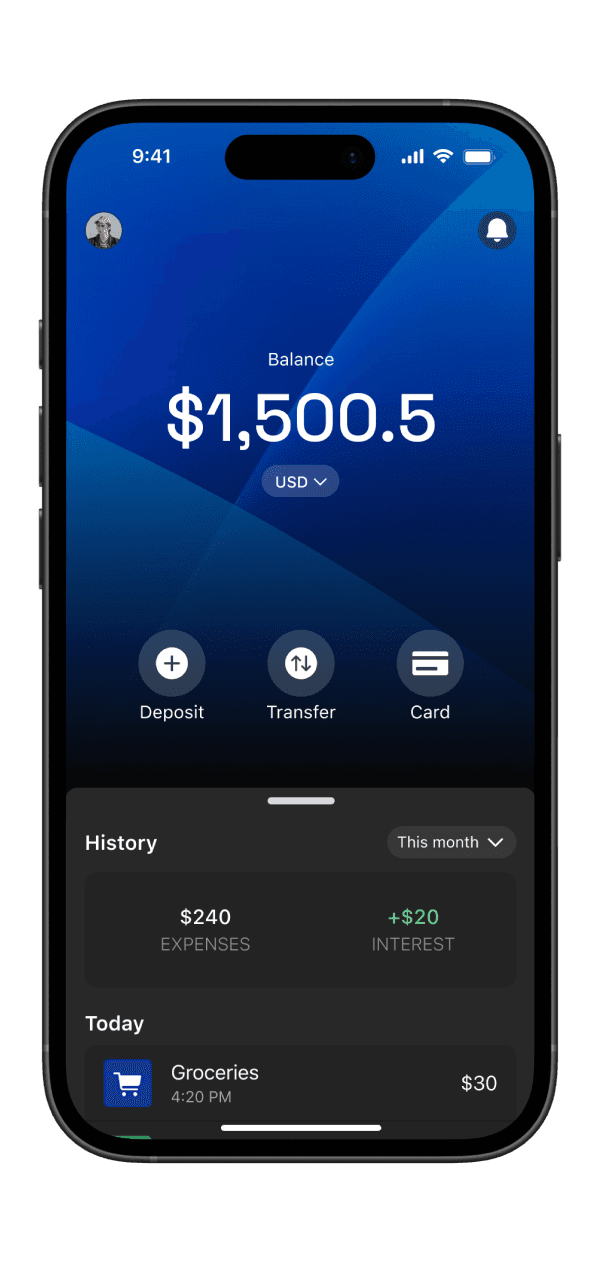 A non-custodial neo-bank where fiat is stored as stablecoins, earns yield via regulated DeFi, and can be spent like everyday money.