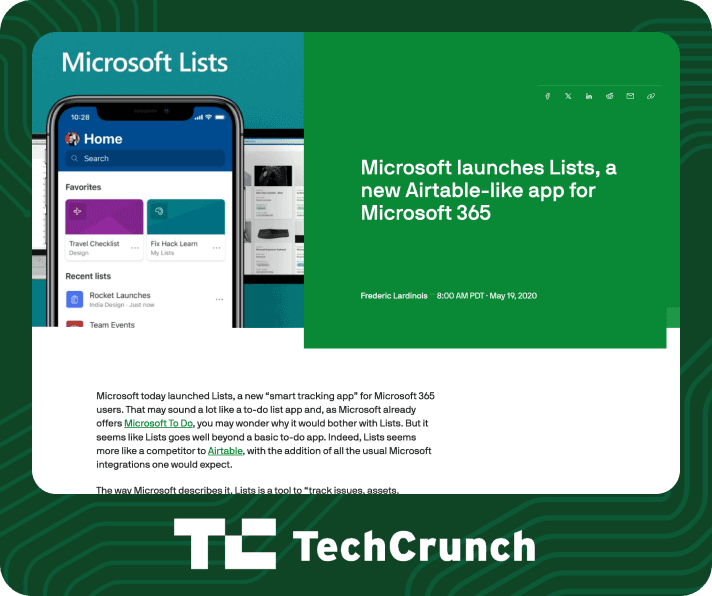Whether it’s inventory, onboarding, or vacation plans, Lists adapts to fit every task with it's powerful, flexible column types.